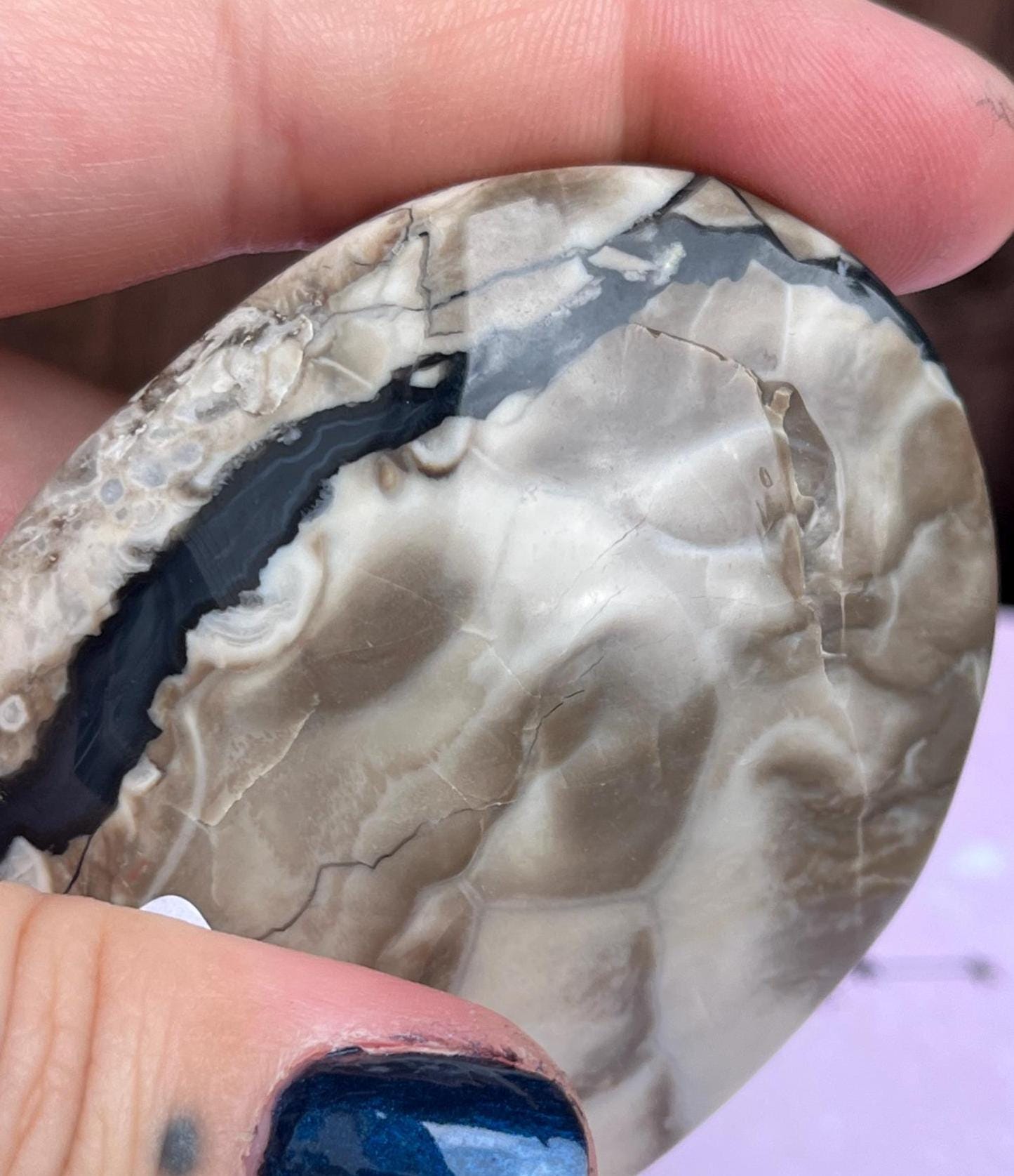 Volcano agate, a type of chalcedony that glows green under UV light, is believed to promote balance, harmony, and grounding. It is also thought to enhance perception, awaken creativity, and strengthen the mind. In crystal meditation, it is sometimes used to soothe spinal issues and lower body organs.